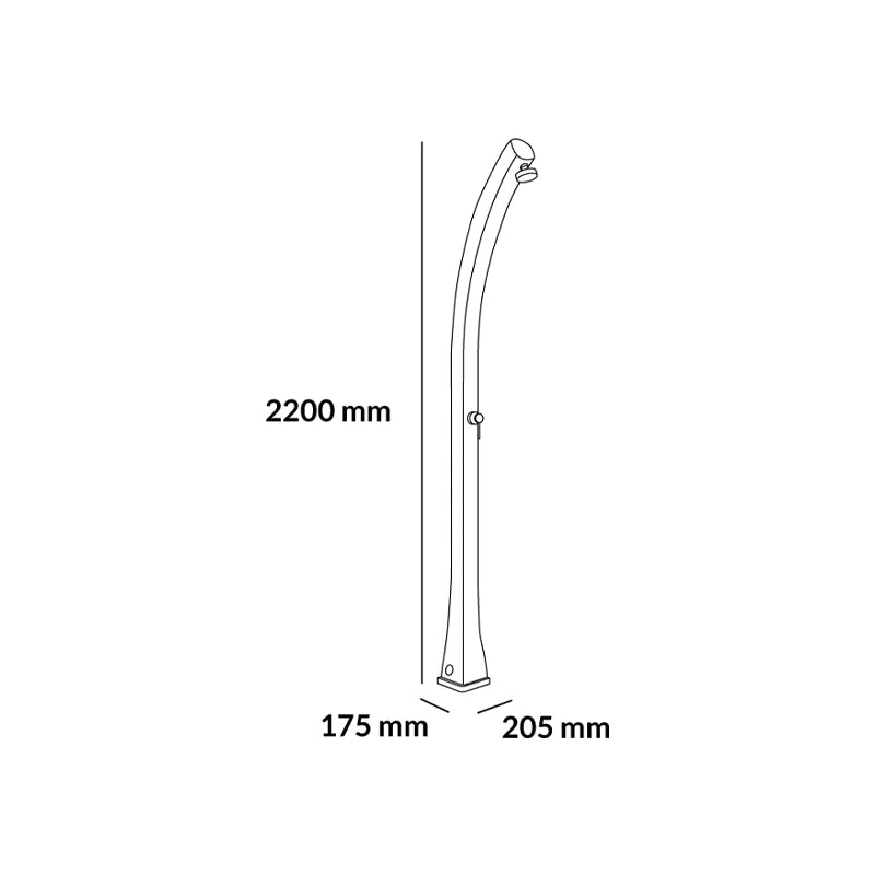 Il materiale è resistente ai raggi UV, alla salsedine e al calcare, rendendo la doccia adatta anche ad ambienti marini o particolarmente esposti. L’acqua contenuta nel serbatoio viene riscaldata naturalmente dal sole, migliorando il comfort nelle giornate più calde.