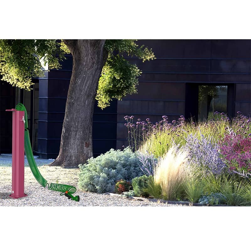 La fontana esterna Arkema in alluminio arancione è dotata di gomma retraibile e pistola di irrigazione a flusso regolabile, ideale per il giardino.