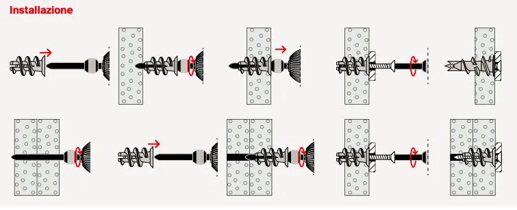 La filettatura speciale assicura una presa stabile e una tenuta elevata, mentre la lunghezza ridotta del fissaggio permette di risparmiare spazio dietro la lastra, rendendolo ideale anche per installazioni in serie. Compatibile con viti legno, autofilettanti e truciolari con diametro 4,0 - 5,0 mm.