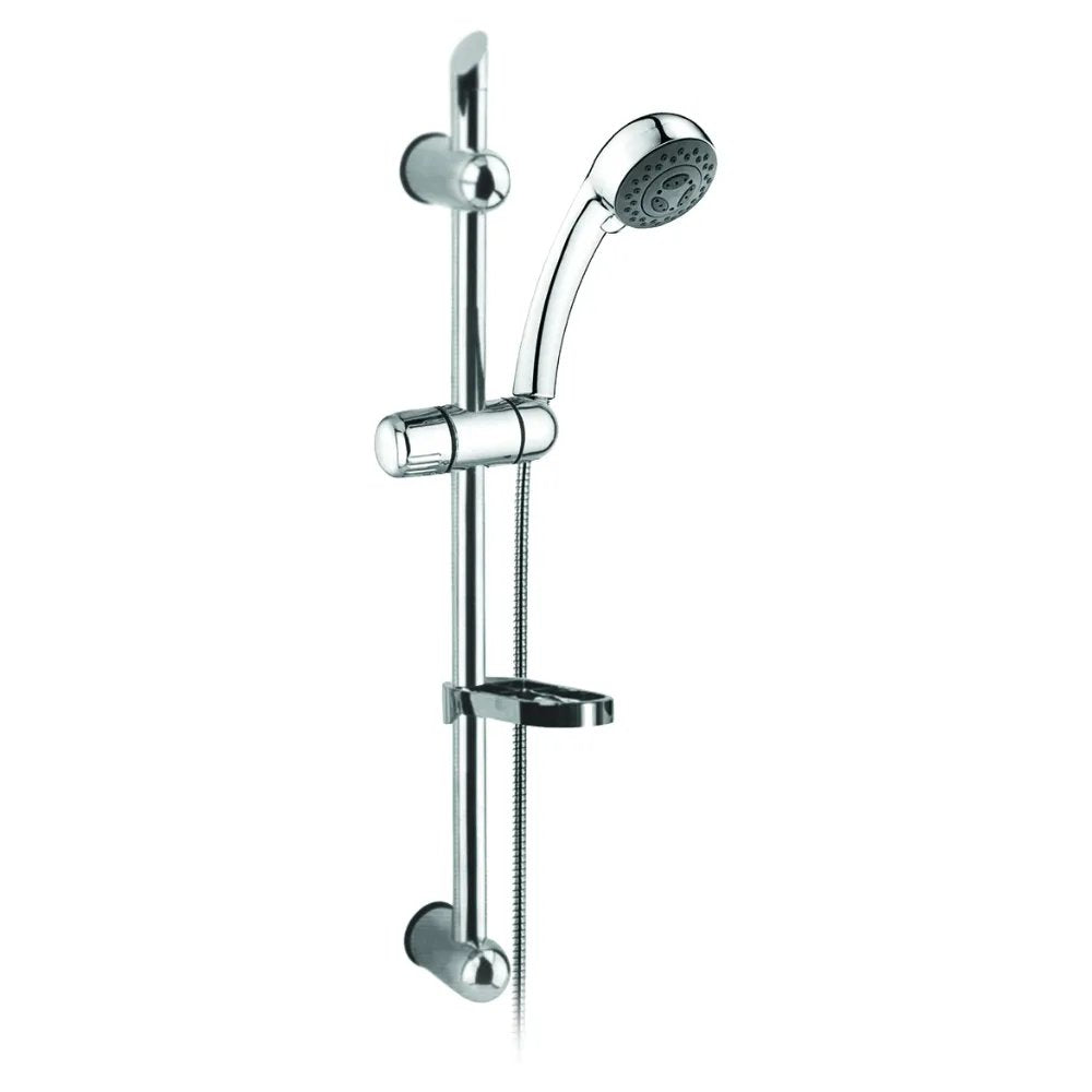 Saliscendi regolabile in acciaio inox cromato con doccetta in ABS, flessibile 150 cm a doppia aggraffatura e portasapone integrato.