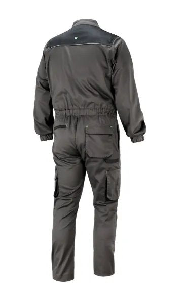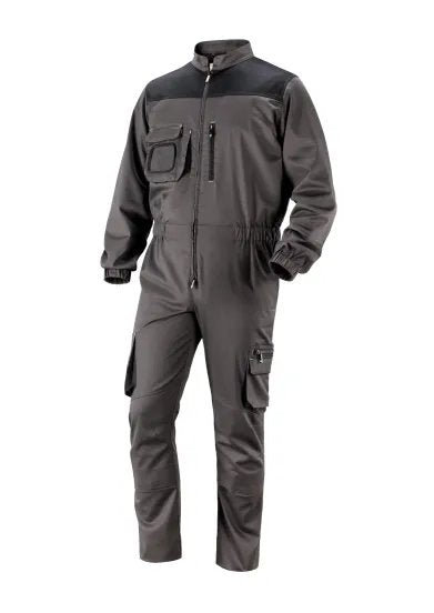 Tuta da lavoro Discovery, realizzata in 65% poliestere, 32% cotone e 3% elastan, offre resistenza, elasticità e praticità. Dotata di numerose tasche multifunzione, ginocchia preformate con porta ginocchiera e vita elasticizzata per un comfort ottimale. Ideale per settori come edilizia, officine e manutenzione.